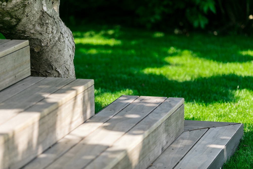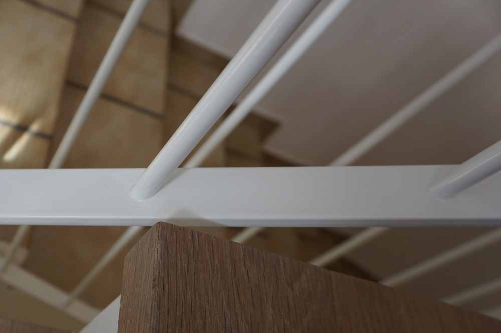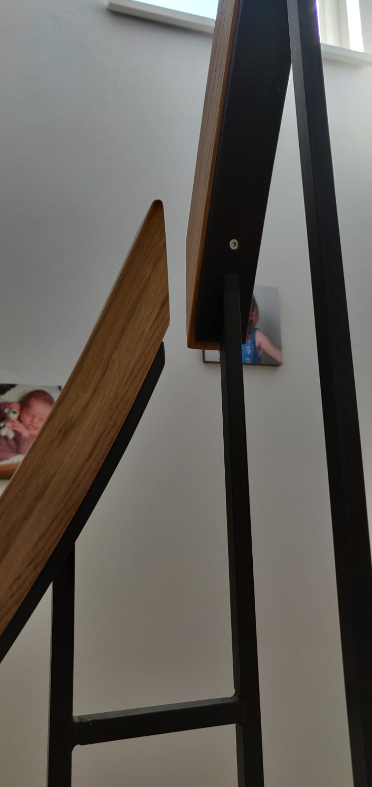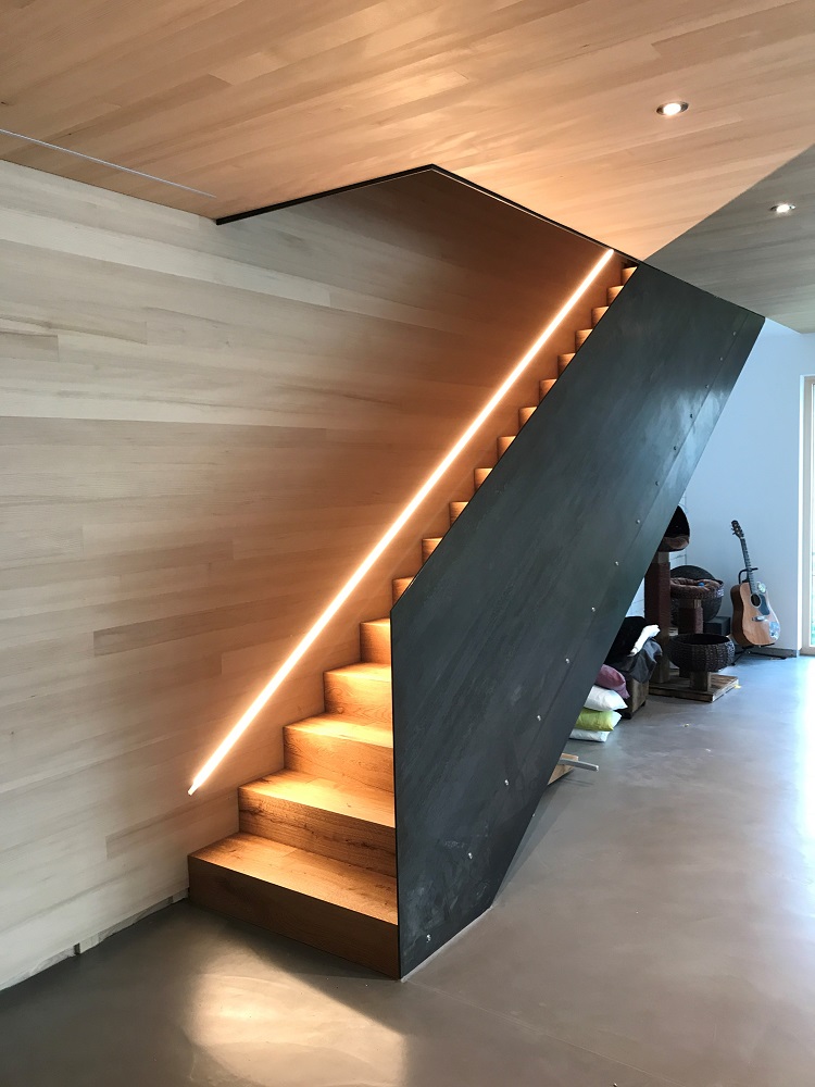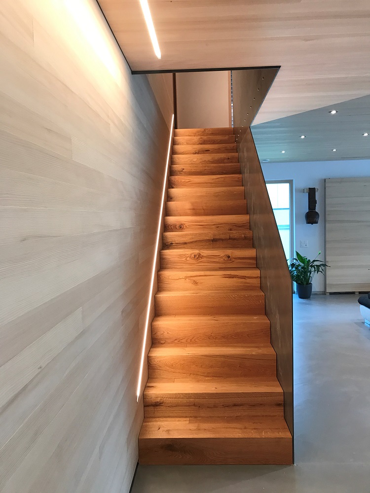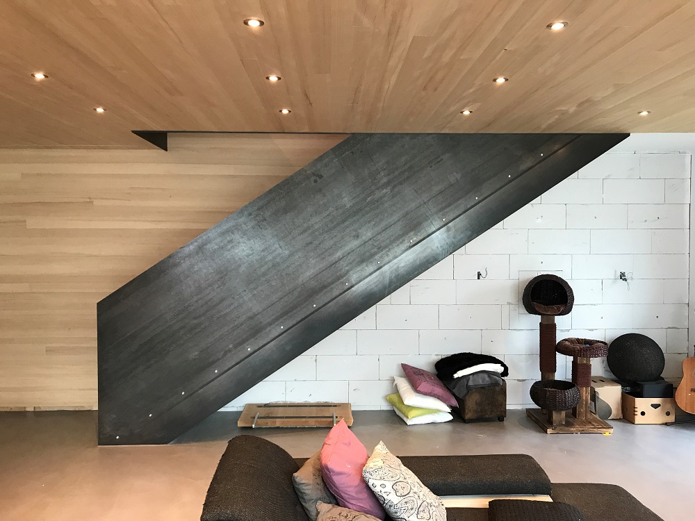 • Nahaufnahme Holztreppe Stahlkonstruktion